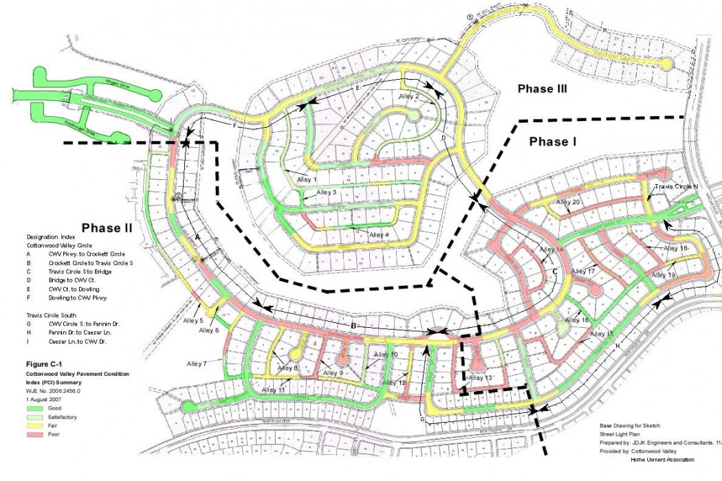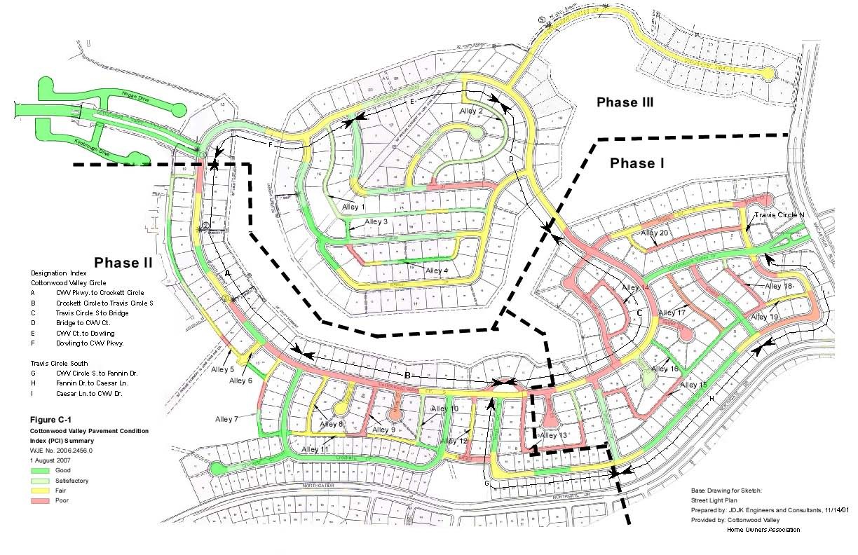 Cottonwood Valley is a 350-acre private residential development that includes approximately sixteen lane miles of portland cement concrete pavement, two security buildings, a park, and various storm water infrastructure elements. As a private development, the client is responsible for the maintenance of all street and alley pavements. The Home Owners Association (Association) funds various maintenance activities through annual assessments and investment programs. Historically, pavement maintenance was reactive, often resulting in out-of-sequence repairs or repairs that failed to meet long term performance and aesthetic objectives.