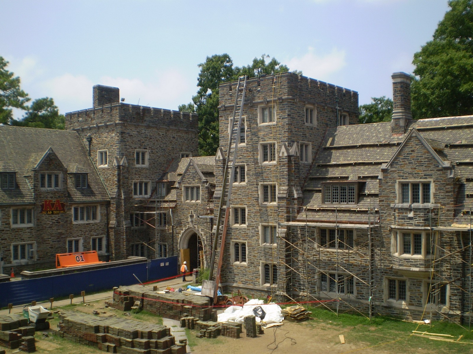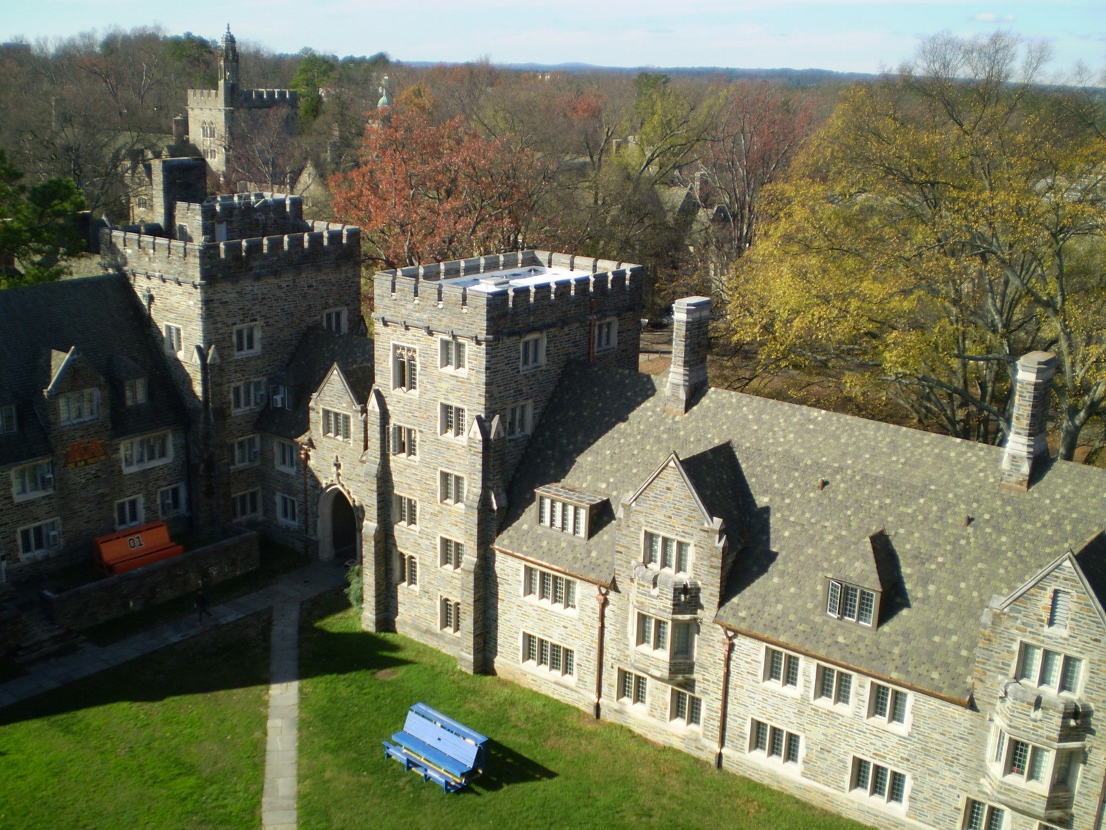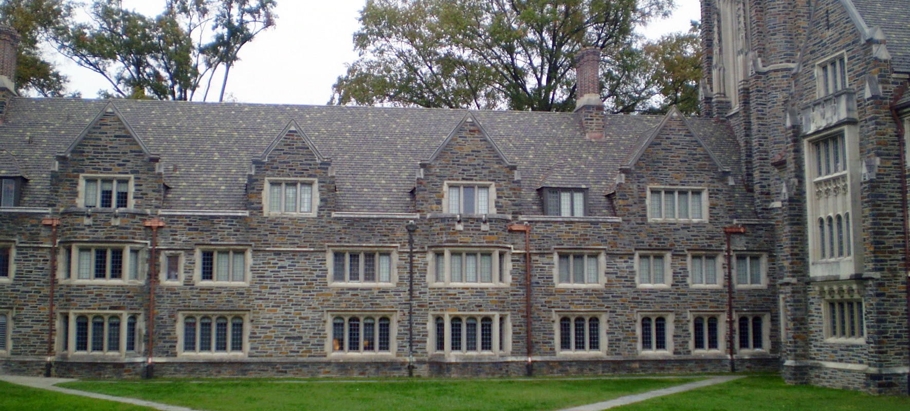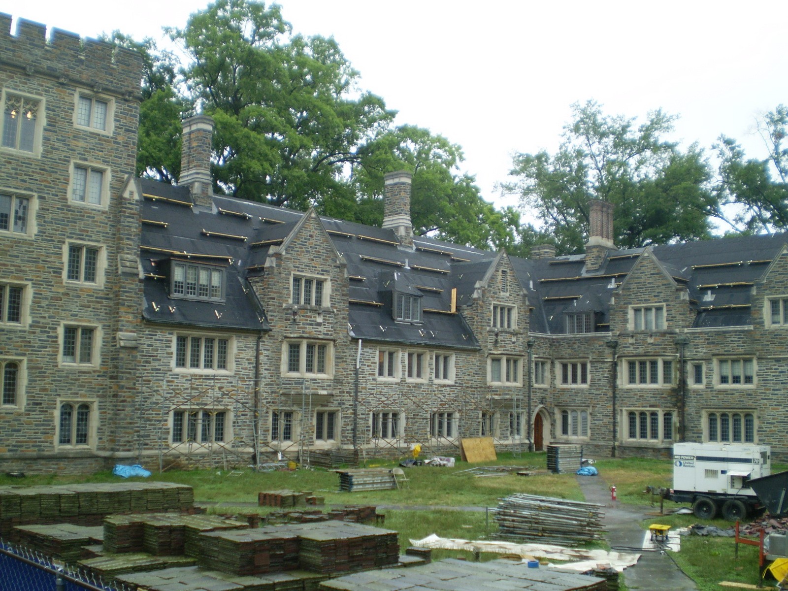 Few Quad is a three- to six-story residential hall located on the West Campus of Duke University, which was completed in the early 1940s. Load bearing exterior masonry walls support steel roof trusses. Gypsum planks formed the nailable deck for the original Ludowici Yale-type clay roof tiles. Flashing, gutters, downspouts, and conductor heads were executed in copper. The highly articulated roof lines are punctuated with several sizes and configurations of dormers and gables.