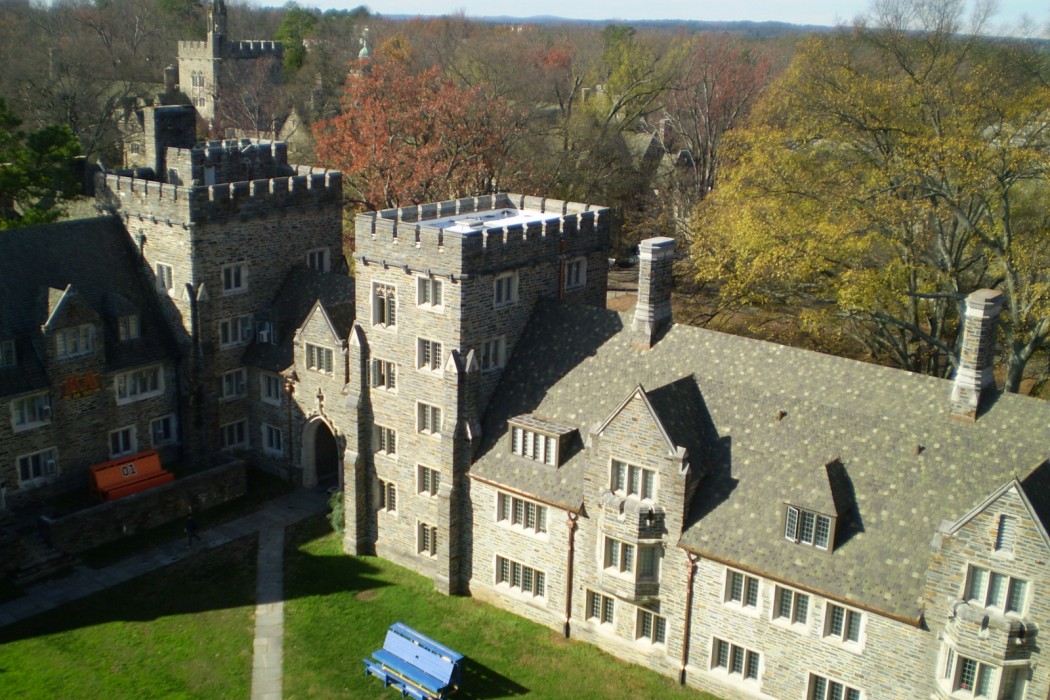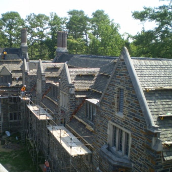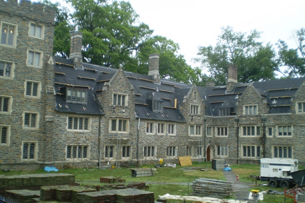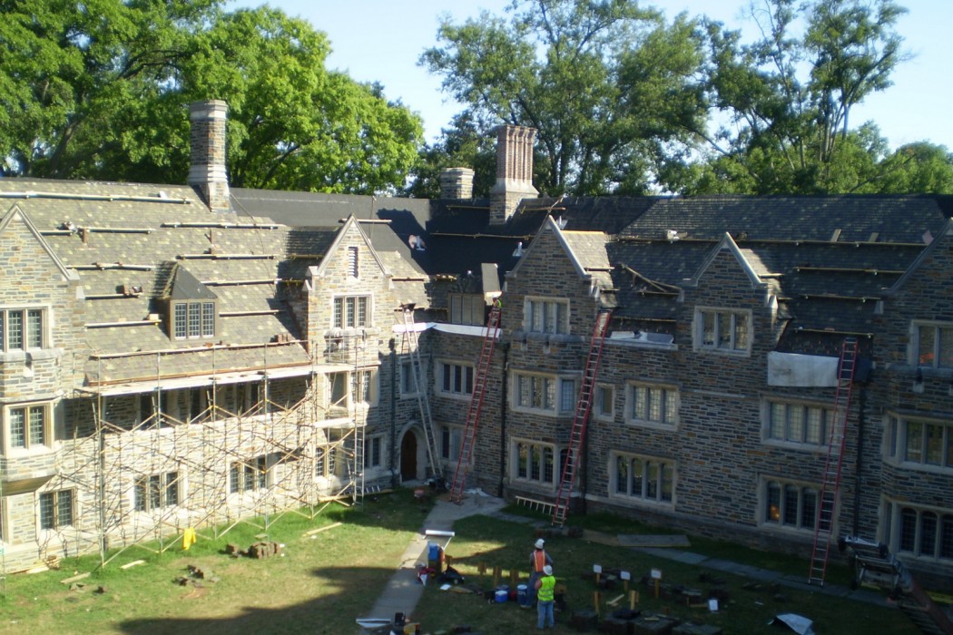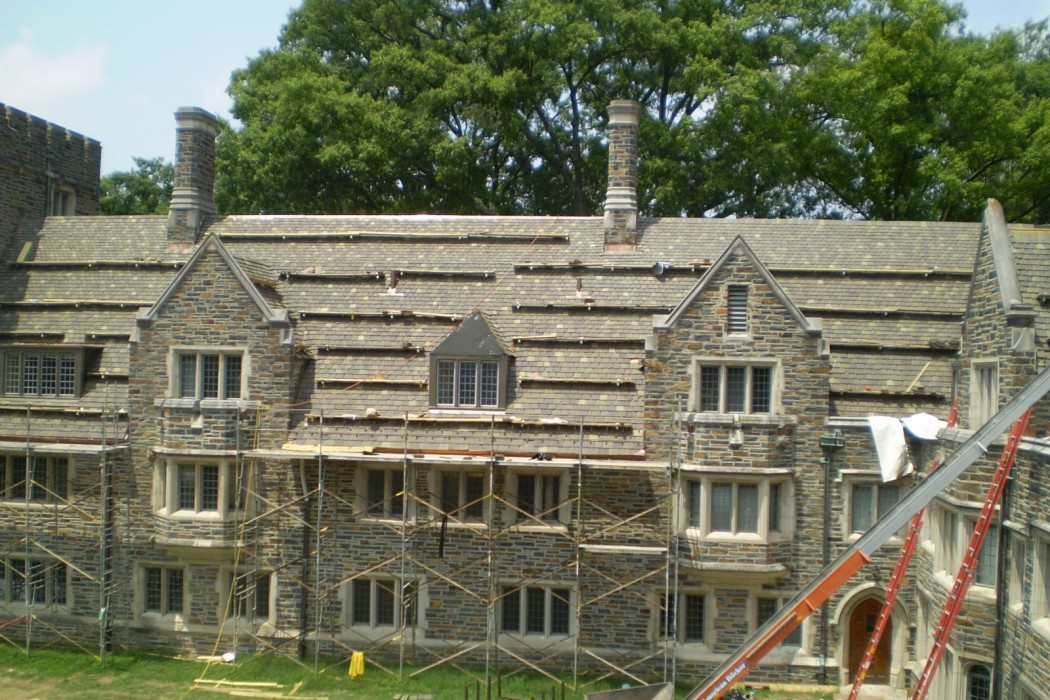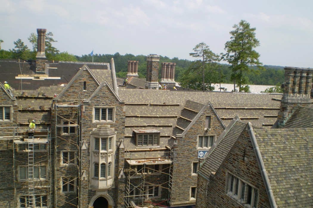 The replacement roof utilized the same historic materials and installation techniques of the original roof to maintain the connection with the past and the rich history of the University. WJE collaborated closely with Duke University and Ludowici to reinstate the discontinued Yale tile shape and to provide a three-color blend to match the aged roofs of adjacent buildings. WJE worked closely with the roofing contractor on-site during construction to ensure proper execution of ridge, valley, gutter, and other termination details, while the contractor diligently sorted construction debris for recycling while protecting the mature landscaping around Few Quad.