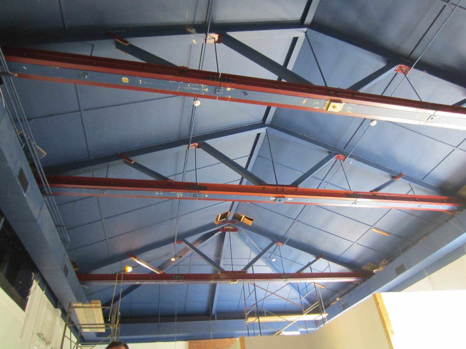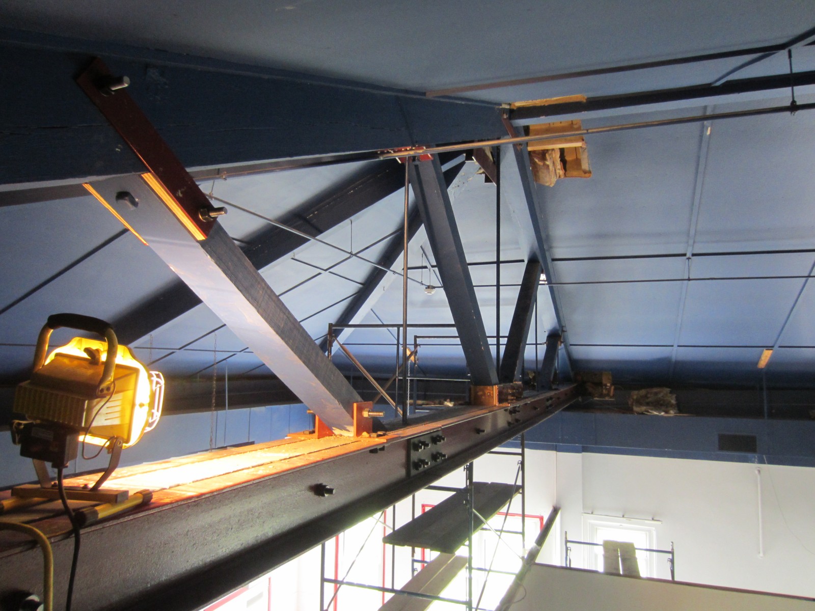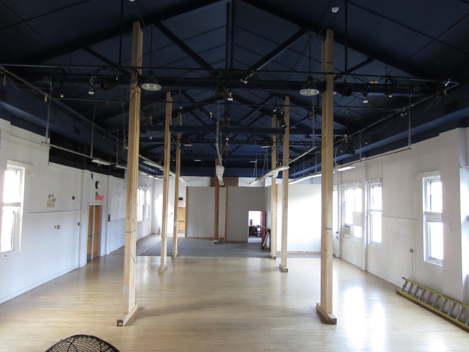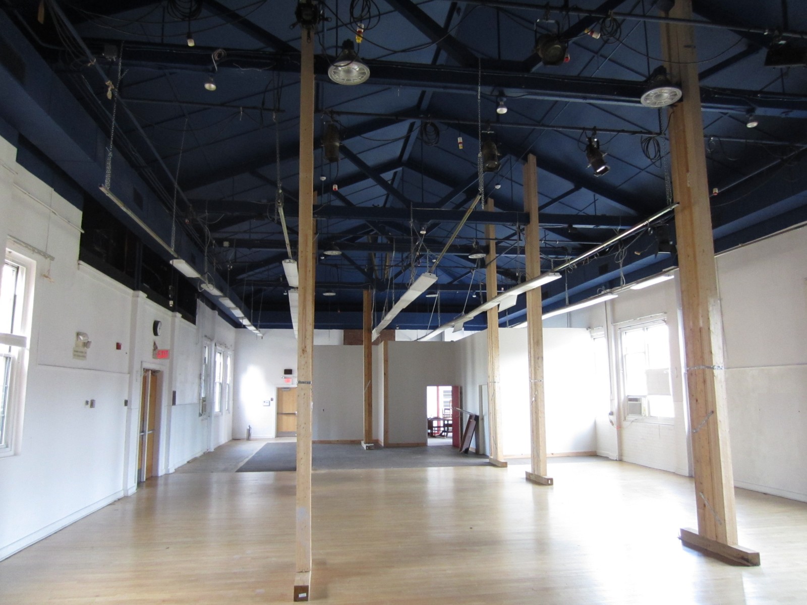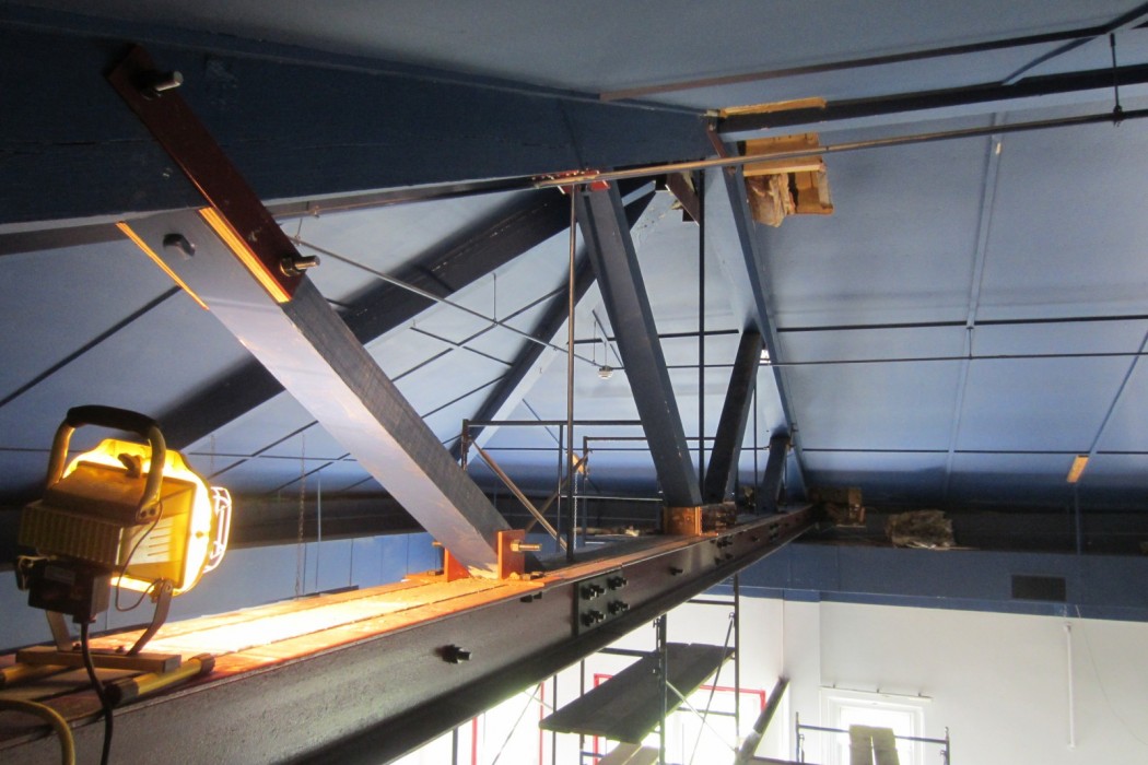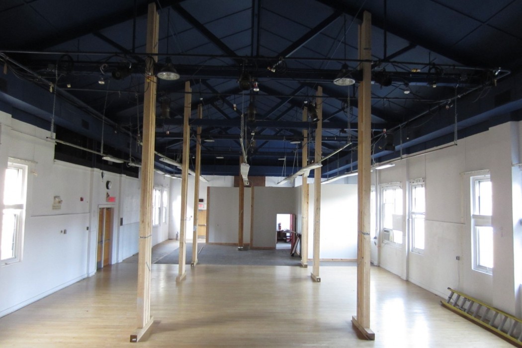 Originally constructed as a gymnasium in 1922, Underhill Hall is a two-story brick structure with a slate roof supported by heavy timber trusses that provide a large column-free space on the second floor. More recently, the building was adapted to provide daycare and office space on the first floor and performing arts rehearsal space on the second floor. Visible distress in the roof trusses, possibly resulting from heavy snow loading during the winter of 2010, prompted closure of the building and the installation of temporary shoring.