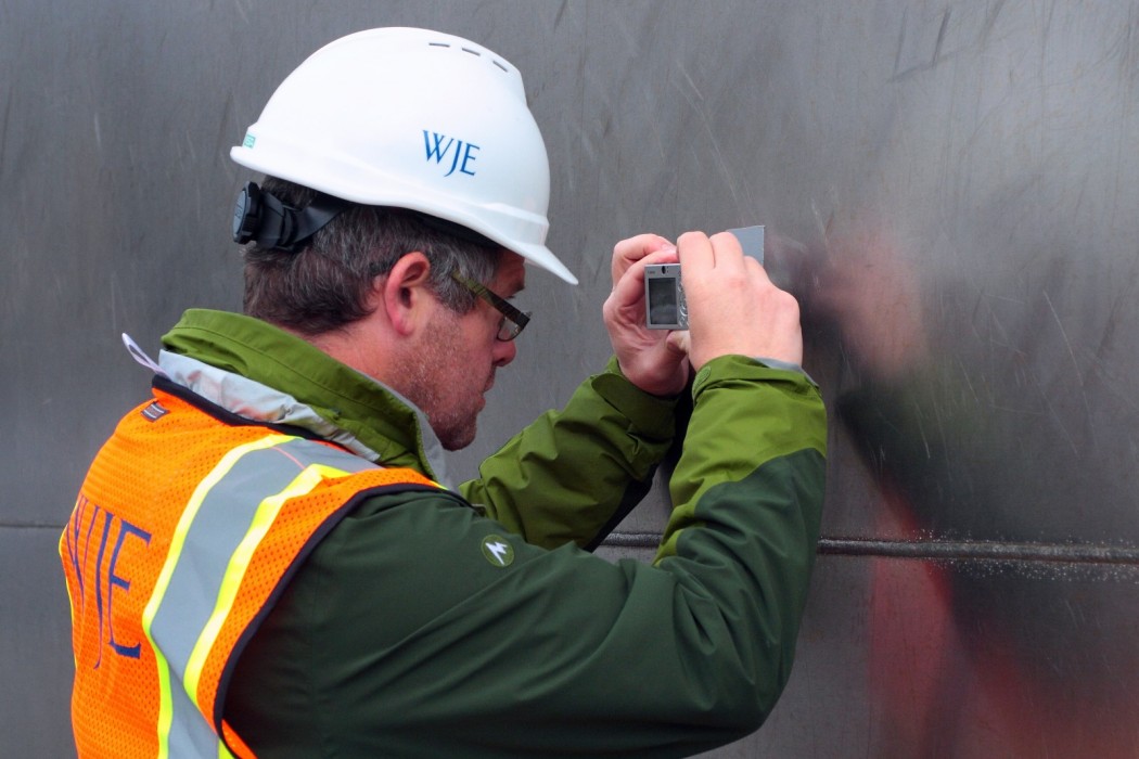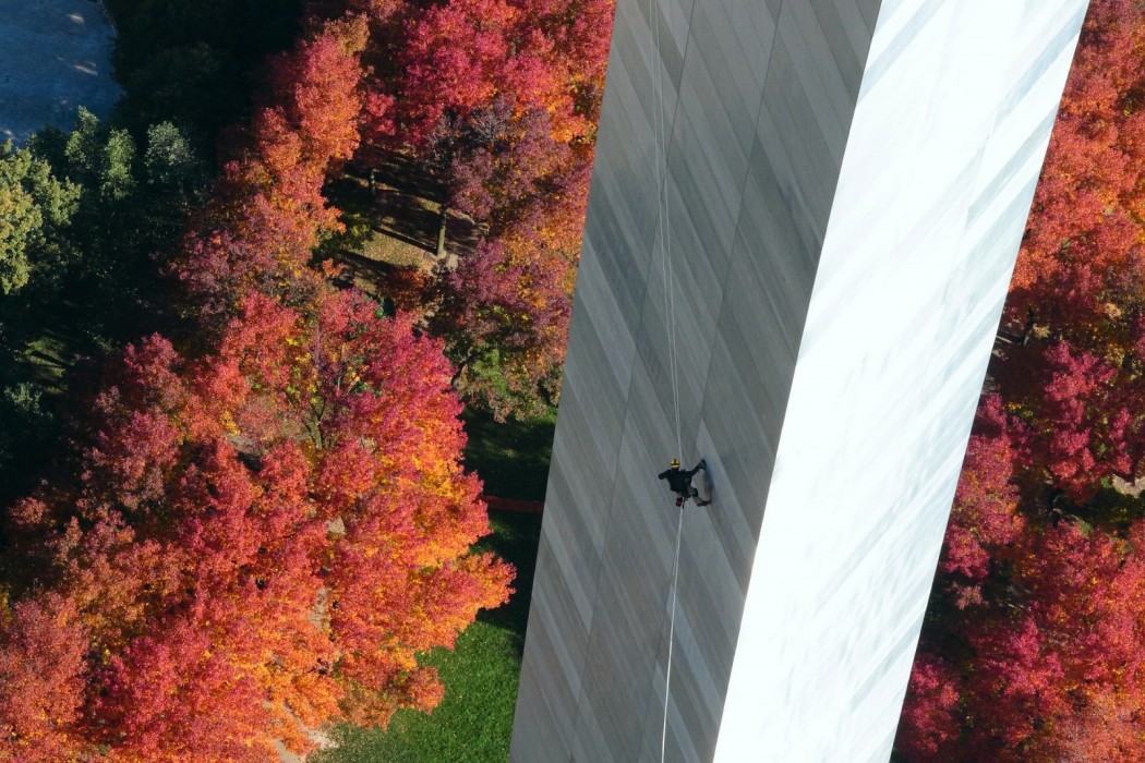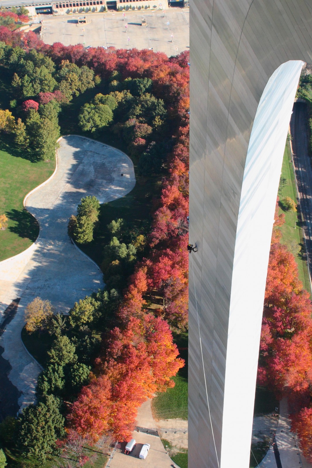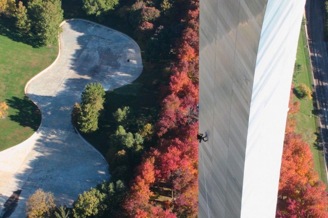 During the final phase, areas of stainless steel that appeared discolored from grade were examined close-up for the first time using industrial rope access techniques. WJE architects, access experts, conservators, and engineers worked collaboratively to document and investigate the causes of the discoloration of the stainless steel skin and to conduct cleaning trials to mitigate their appearance. The work of all team members, including the National Park Service, was critical to identify, assess, and develop treatment recommendations for the long-term preservation of the Arch. WJE's expertise in materials conservation, engineering, and extensive experience in preservation techniques contributed to meet the client's goal to develop a long-term preservation plan.