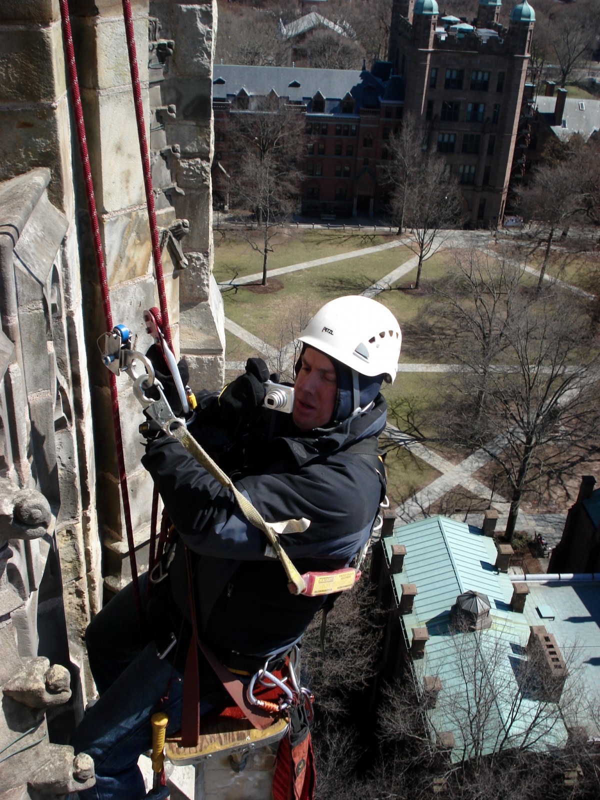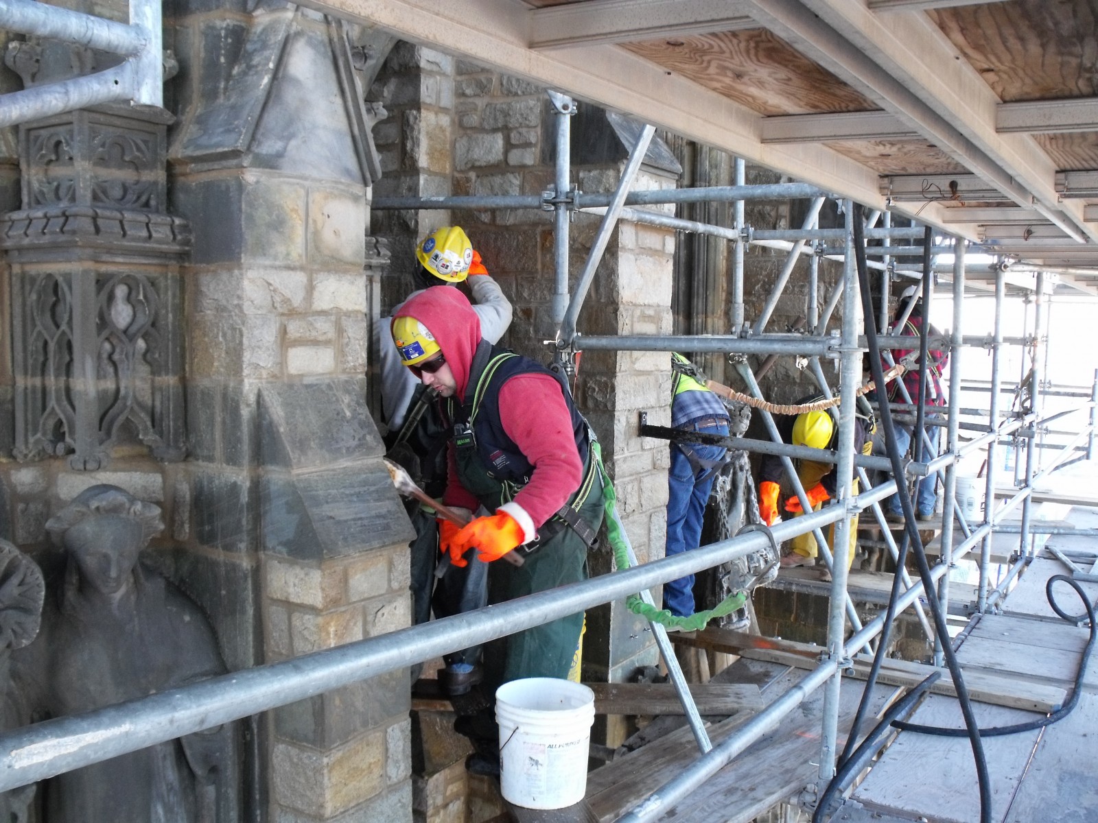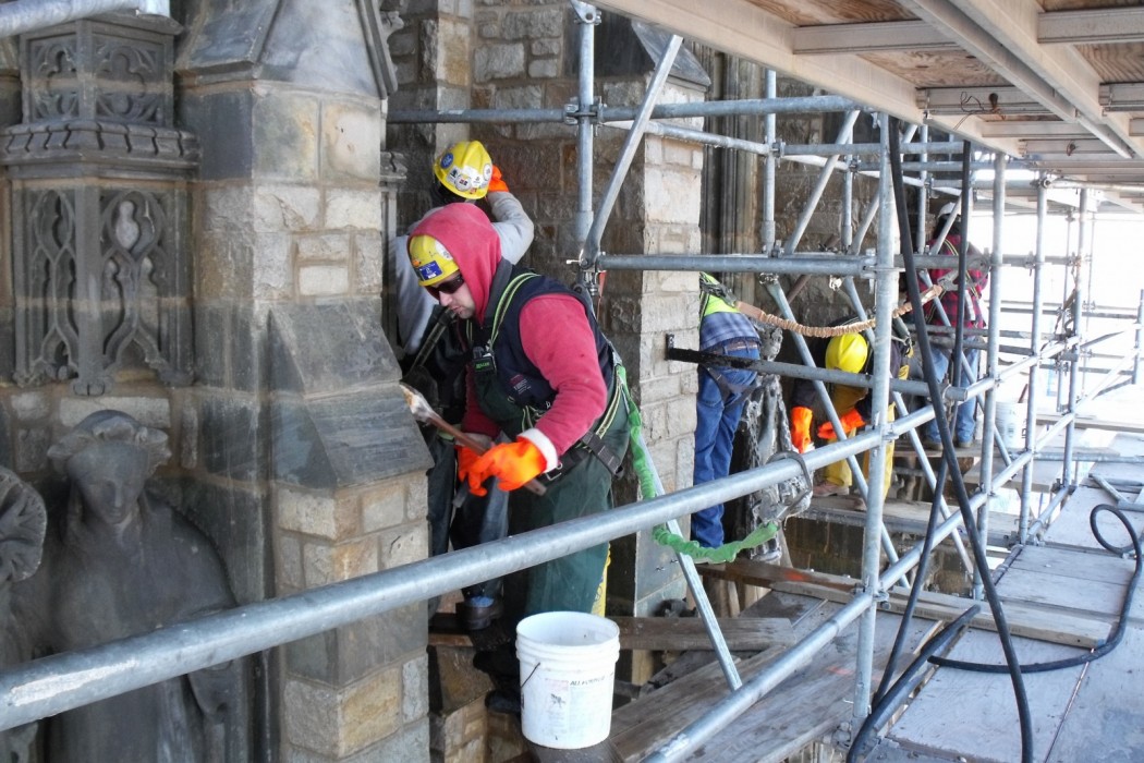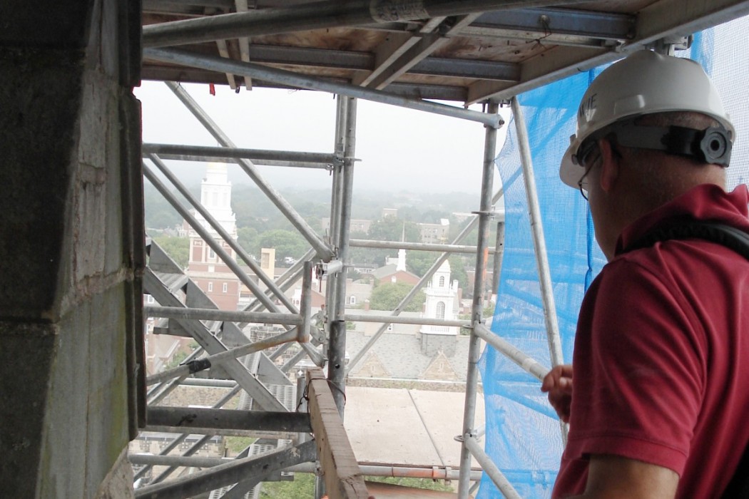 Utilizing the Difficult Access Team, WJE's investigation revealed extensive organic growth at the north side of the tower; erosion and spalling of the sandstone and brick; significant cracks in the granite at the tower's corner buttresses; loose, missing, and cracked mortar; spalling of concrete at roof and floor decks; steel corrosion at doors and windows; bowing of lead cames at the stained glass window; loose and missing clay tile at louvers; and loose quarry tile and failed mortar beds at the roof, balconies, and floors exposed to the exterior. WJE also observed that the lightning protection system was in disrepair.
