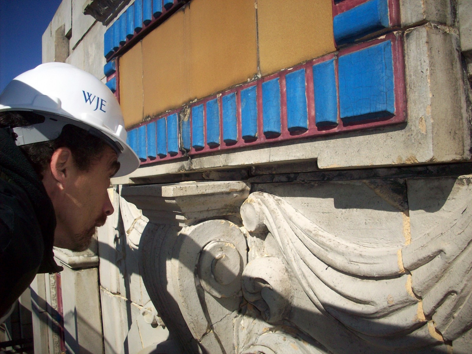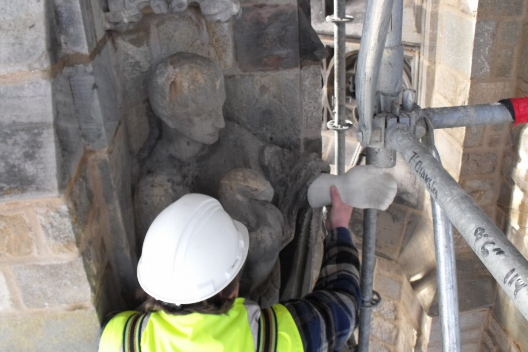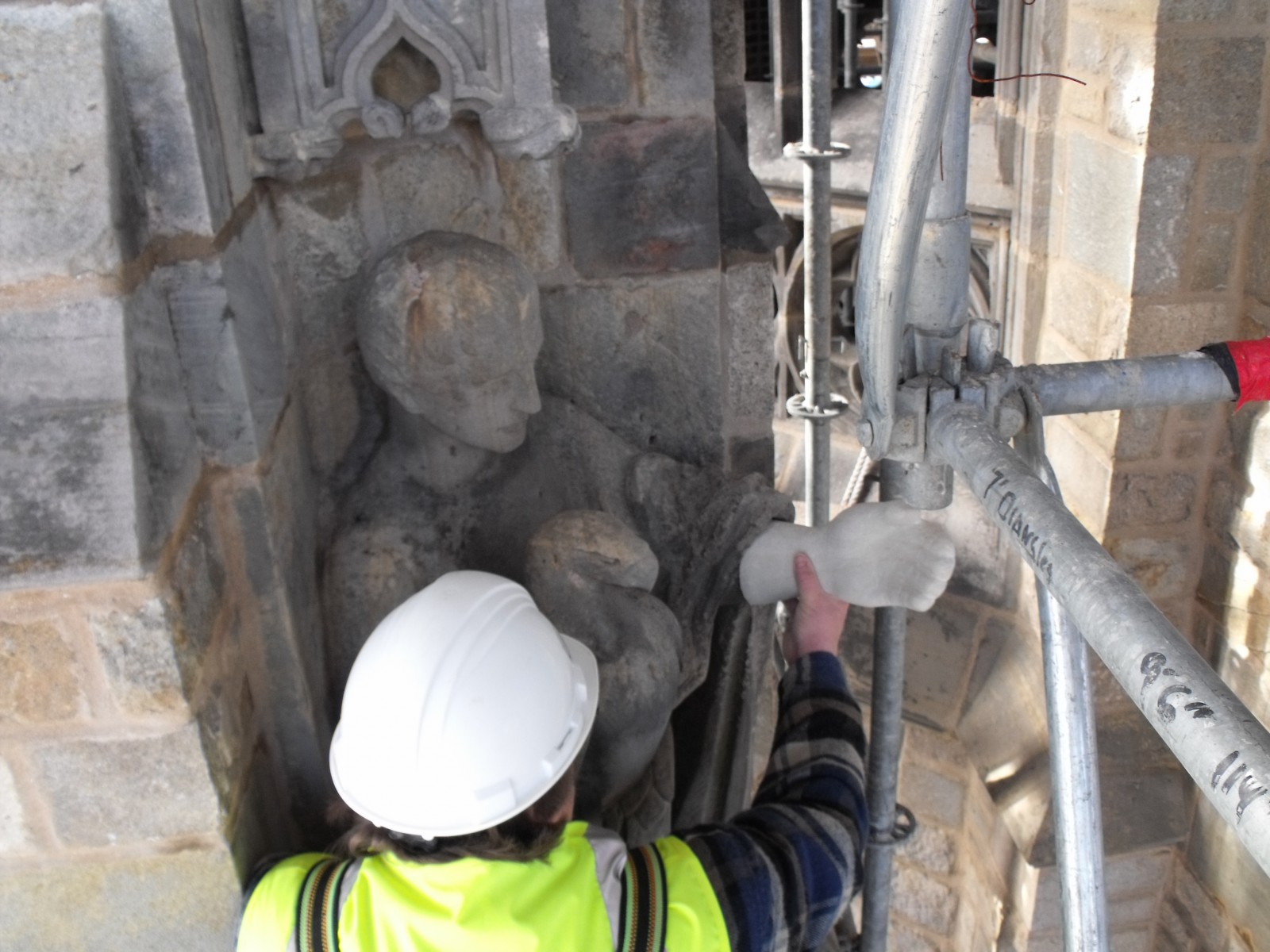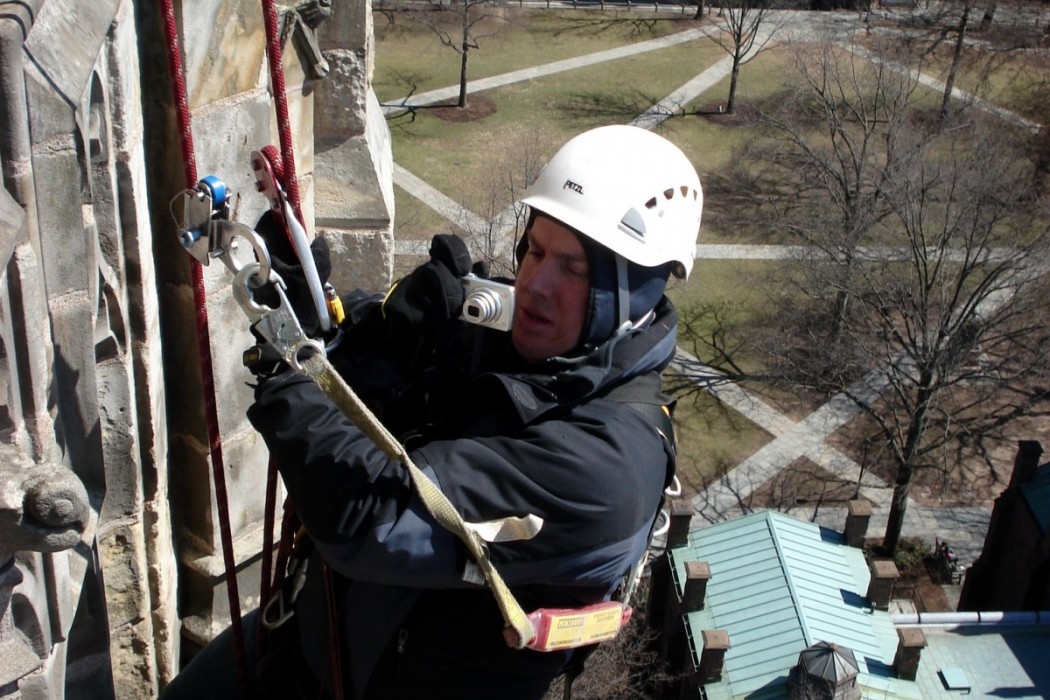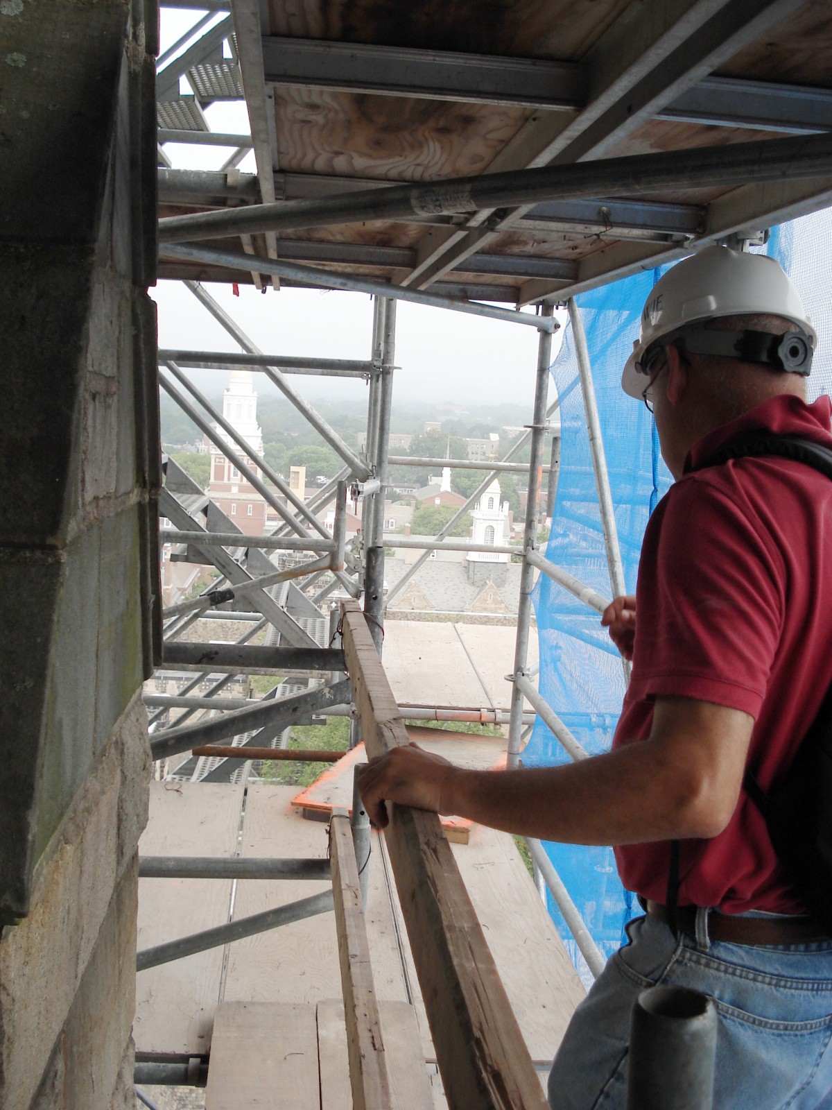 Utilizing the Difficult Access Team, WJE's investigation revealed extensive organic growth at the north side of the tower; erosion and spalling of the sandstone and brick; significant cracks in the granite at the tower's corner buttresses; loose, missing, and cracked mortar; spalling of concrete at roof and floor decks; steel corrosion at doors and windows; bowing of lead cames at the stained glass window; loose and missing clay tile at louvers; and loose quarry tile and failed mortar beds at the roof, balconies, and floors exposed to the exterior. WJE also observed that the lightning protection system was in disrepair.