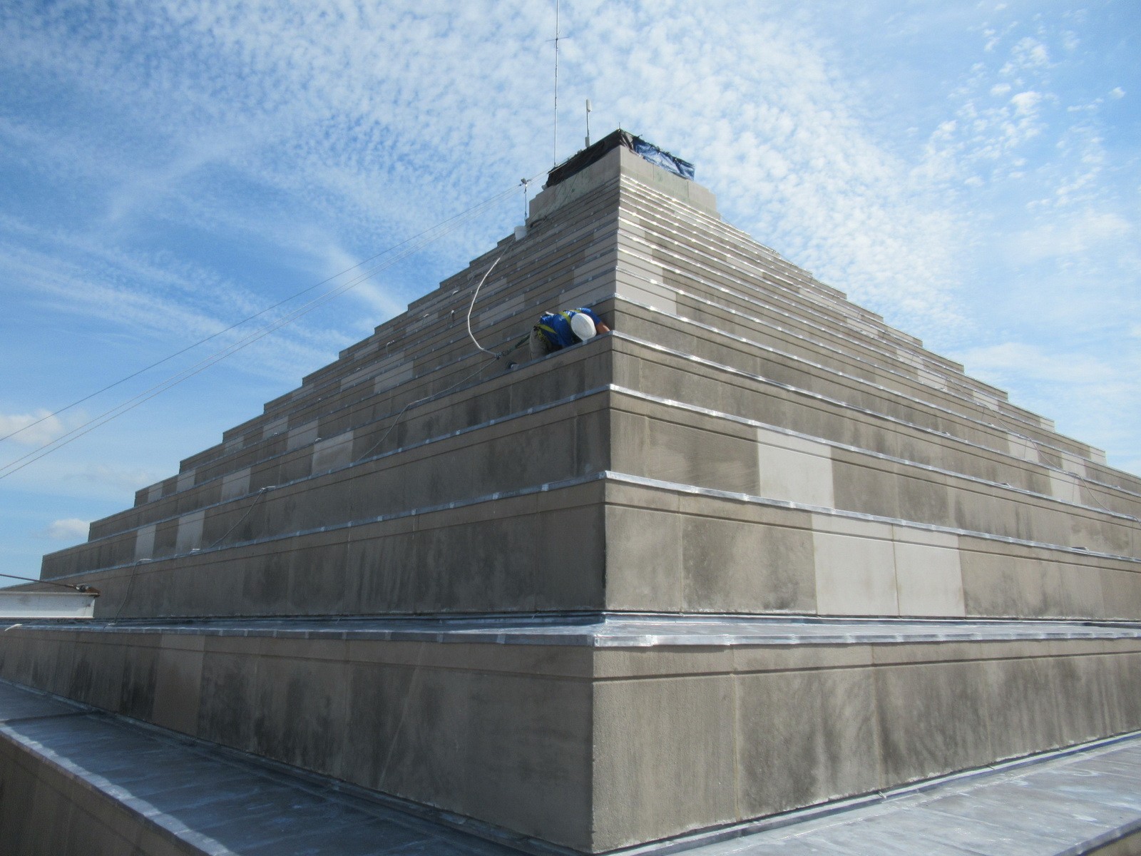 WJE developed construction documents to replace the roofing systems and remove all limestone cladding at the ziggurat, incorporate a new waterproofing membrane below the cladding, and install new lead-coated copper flashings.