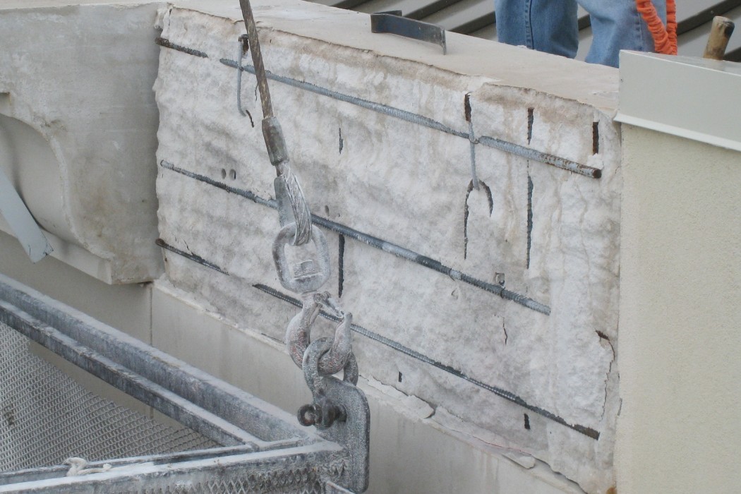 The engineers thus compared the cladding anchorage system to as-built drawings and toured the cast stone plant where the facade materials were fabricated to inspect the design features and installation methods. Additionally, WJE materials scientists performed petrographic tests of cast stone core samples to determine composition, compressive strength, absorption, and specific gravity. Results of the investigation indicated the use of poor quality materials and the lack of proper transverse reinforcement.