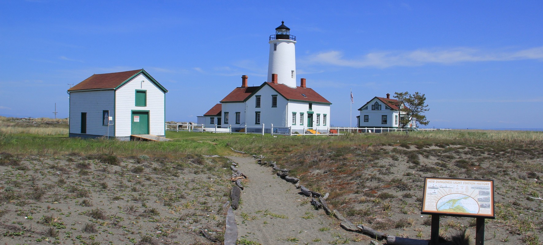 First constructed and lit in 1857 and added to the National Register of Historic Places in 1993, the New Dungeness Light Station was the first U.S. lighthouse completed on the Strait of Juan de Fuca. Originally 91 feet tall, the tower was lowered to its current height of 63 feet in 1927 over deterioration concerns.