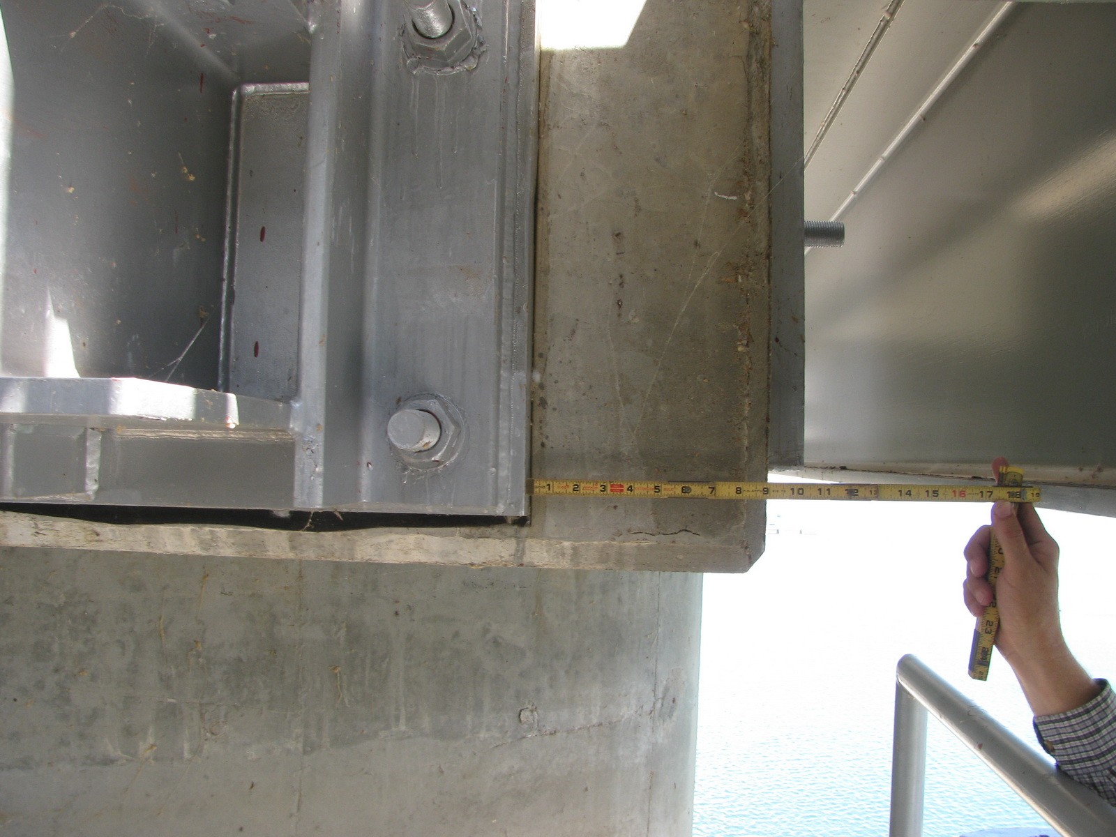 During construction of the bulkhead, cracking, delamination, and other concrete distress were observed beneath bolted connection brackets supporting the bulkhead. Additionally, new, post-installed concrete anchors that fastened the connection brackets to existing dam pier caps were installed closer to the edge of the pier cap than specified by the engineer of record. Rather than implementing extensive repairs and modifications, the clients enlisted the services of WJE to perform a peer review of the structural design and an evaluation of the as-built strength.