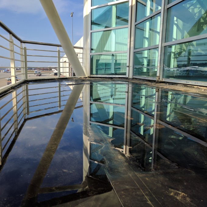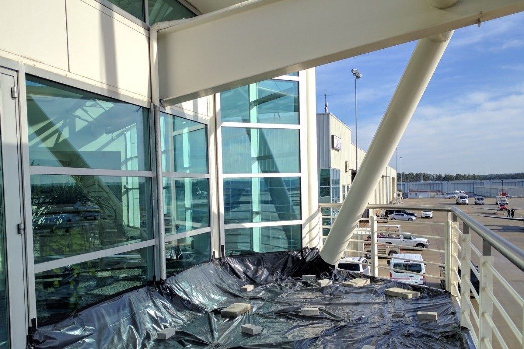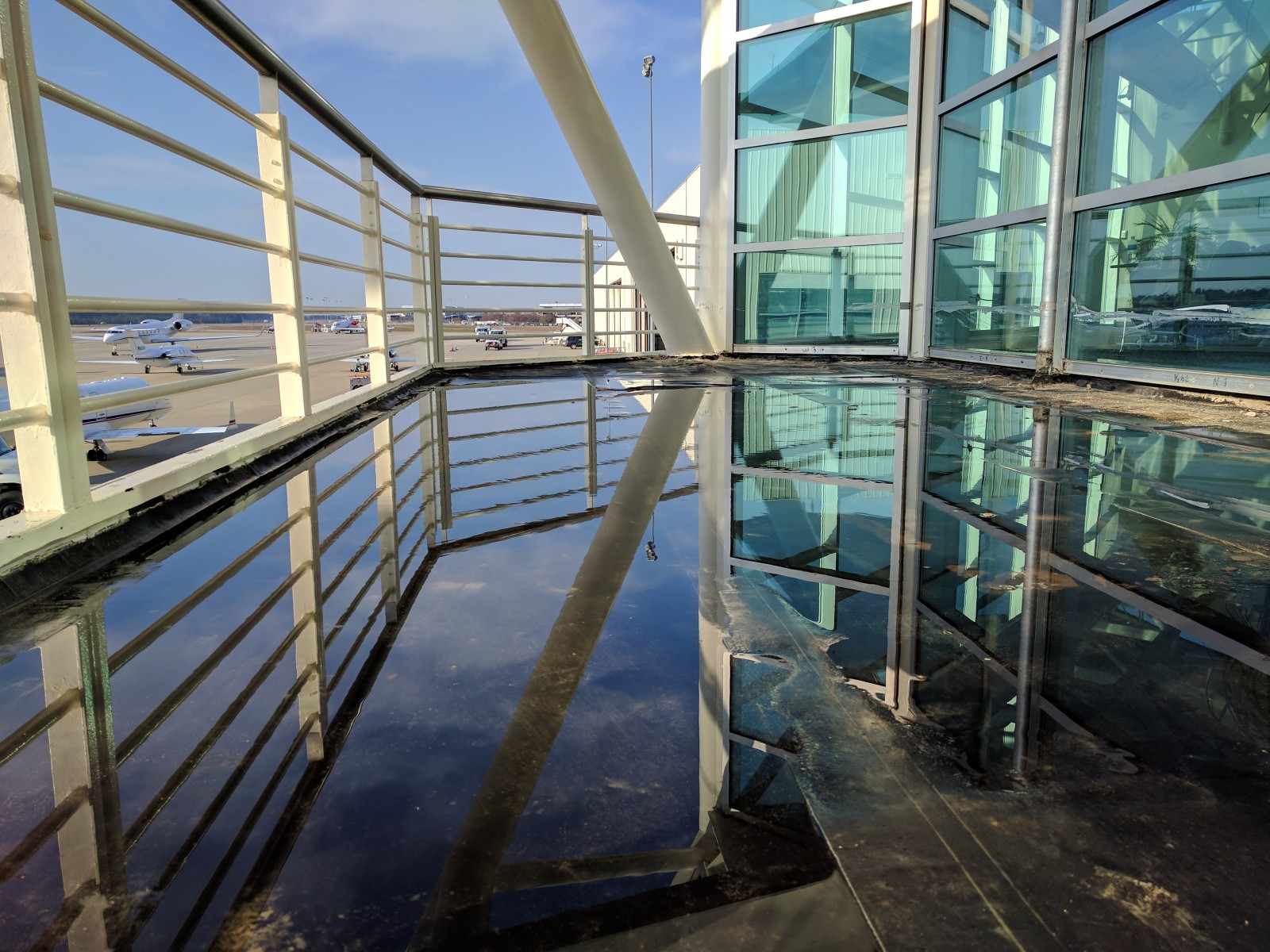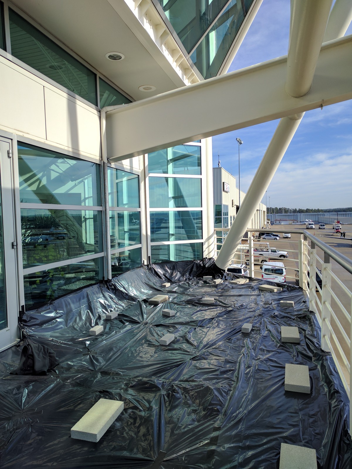 The General Aviation Terminal (GAT) at Raleigh-Durham International Airport (RDU) was originally constructed in 2002 and was designed by The Freelon Group (now Perkins+Will). The original deck waterproofing assembly and exterior floor tile were replaced in 2016 with a new hot-rubberized asphalt waterproofing system, mortar bed, and tile. The repair work successfully addressed water leakage at the structural penetrations; however, water penetration continued via alternate leak pathways. Interior finish damage was evident at the suspended ceiling tiles and gypsum sheathed ceilings in the first floor atrium space and air-side vestibule below the deck.