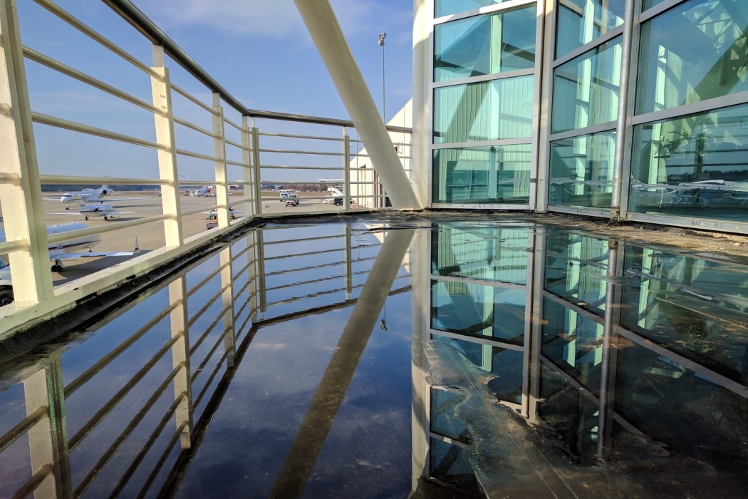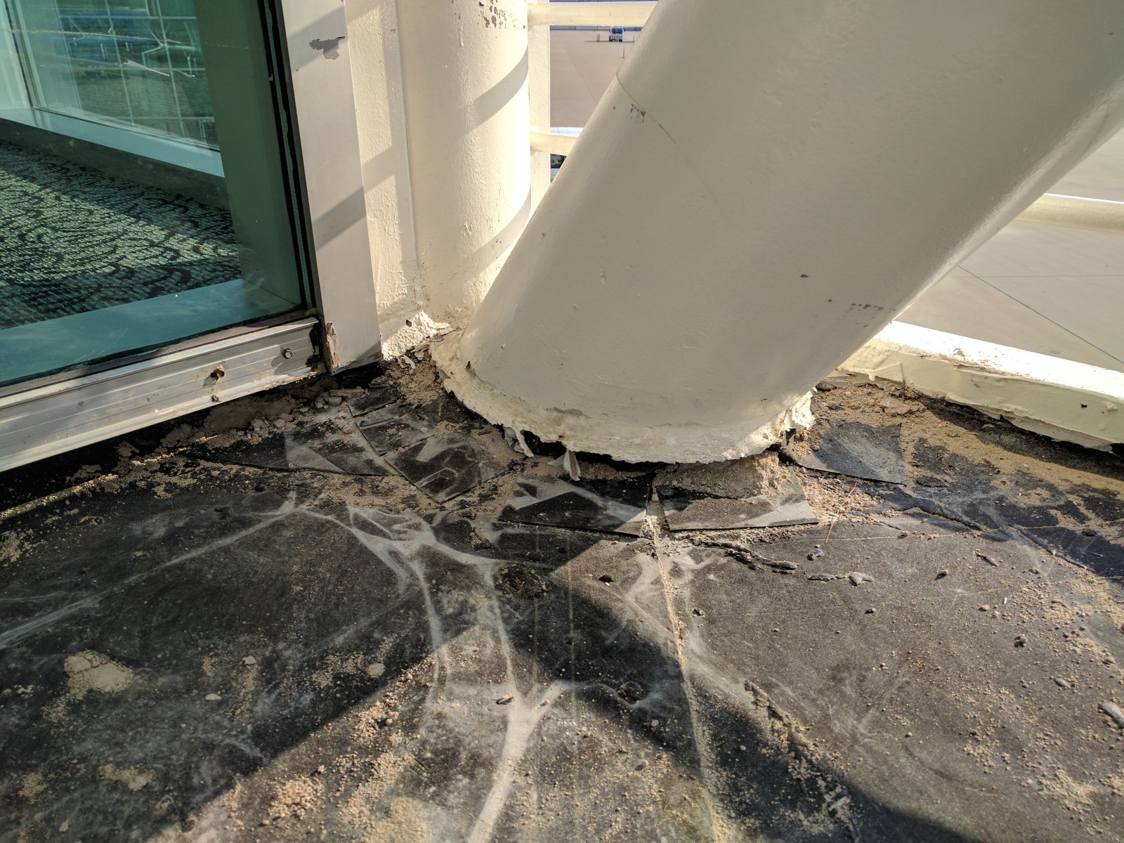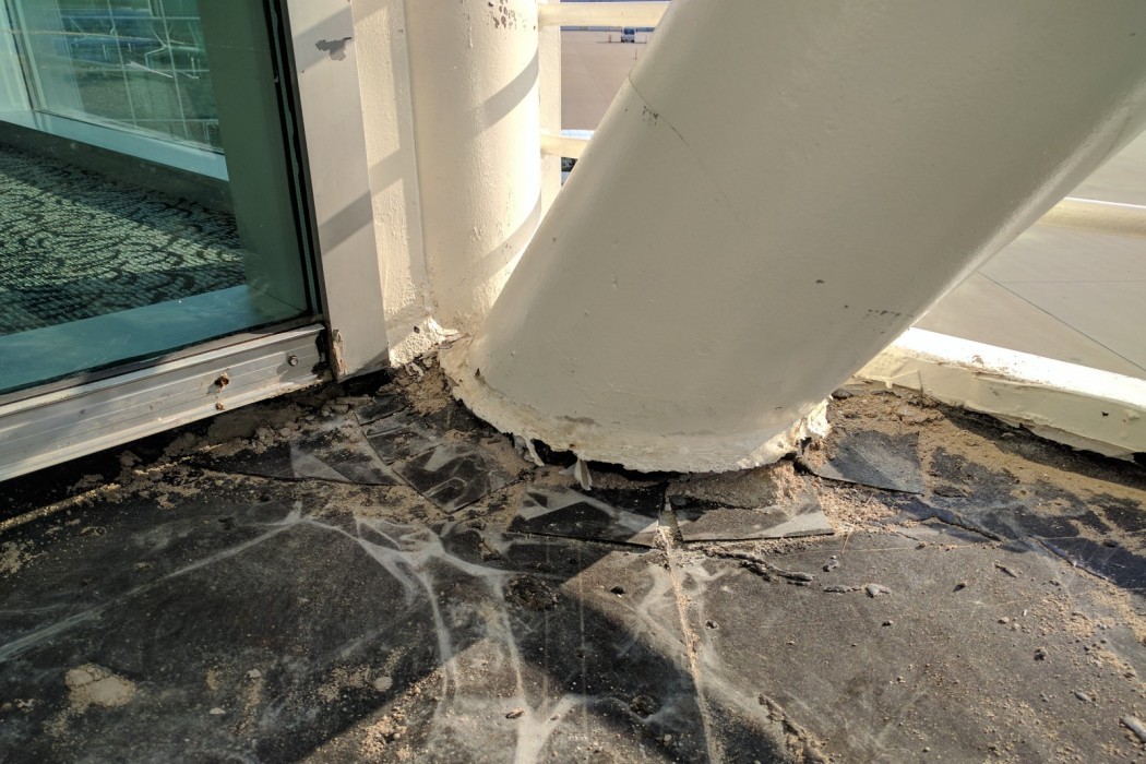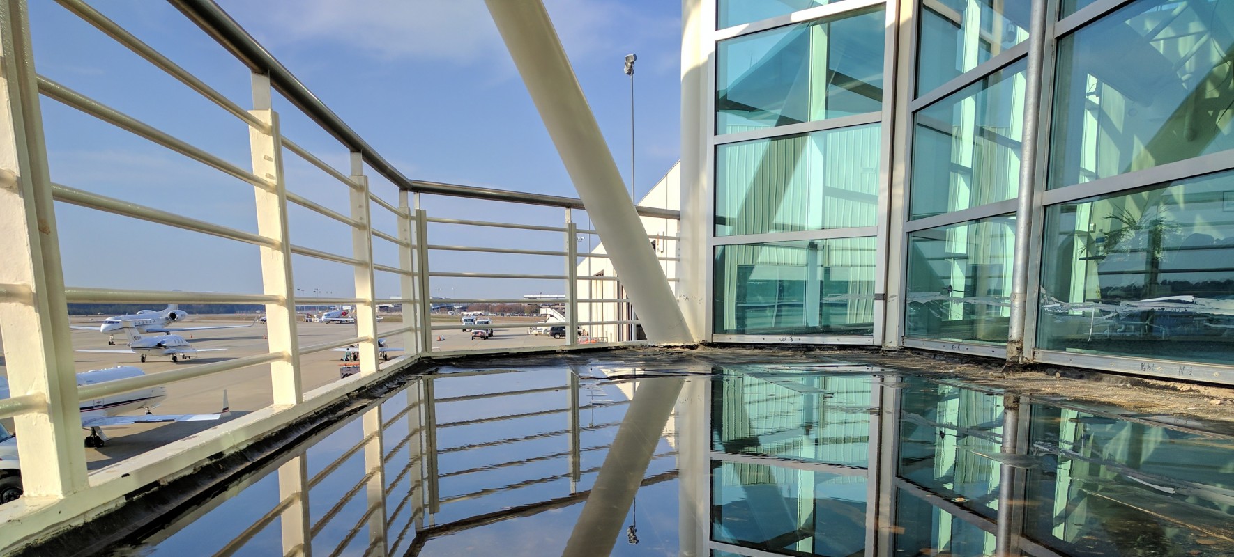 The General Aviation Terminal (GAT) at Raleigh-Durham International Airport (RDU) was originally constructed in 2002 and was designed by The Freelon Group (now Perkins+Will). The original deck waterproofing assembly and exterior floor tile were replaced in 2016 with a new hot-rubberized asphalt waterproofing system, mortar bed, and tile. The repair work successfully addressed water leakage at the structural penetrations; however, water penetration continued via alternate leak pathways. Interior finish damage was evident at the suspended ceiling tiles and gypsum sheathed ceilings in the first floor atrium space and air-side vestibule below the deck.