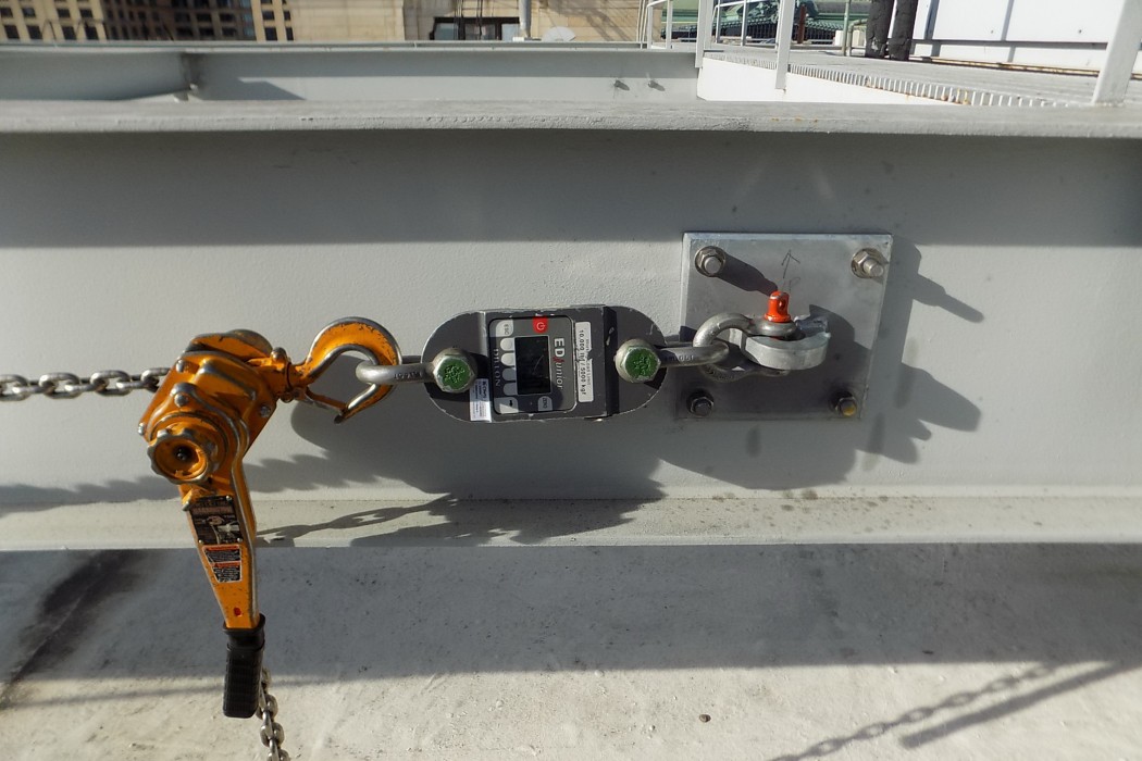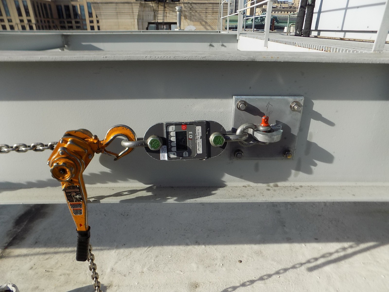 Each anchorage point was loaded in a manner that replicated the minimum design load (i.e., 5,000 pounds) required by OSHA and the Chicago Building Code in potential directions of use. The new equipment sustained the test load in an appropriately elastic manner and was certified for use.