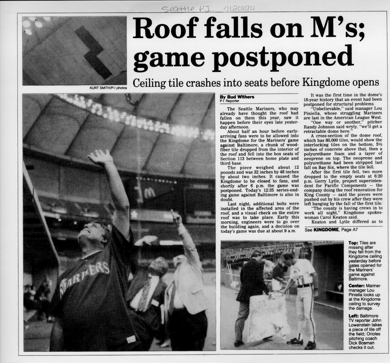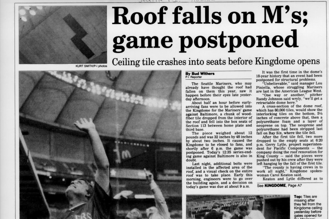 On July 19, 1994, just prior to a Seattle Mariners baseball game, several acoustical ceiling panels fell from the underside of the dome to the empty seats below, prompting the closing of the stadium and an immediate, comprehensive investigation. WJE was retained and arrived on site the next day.