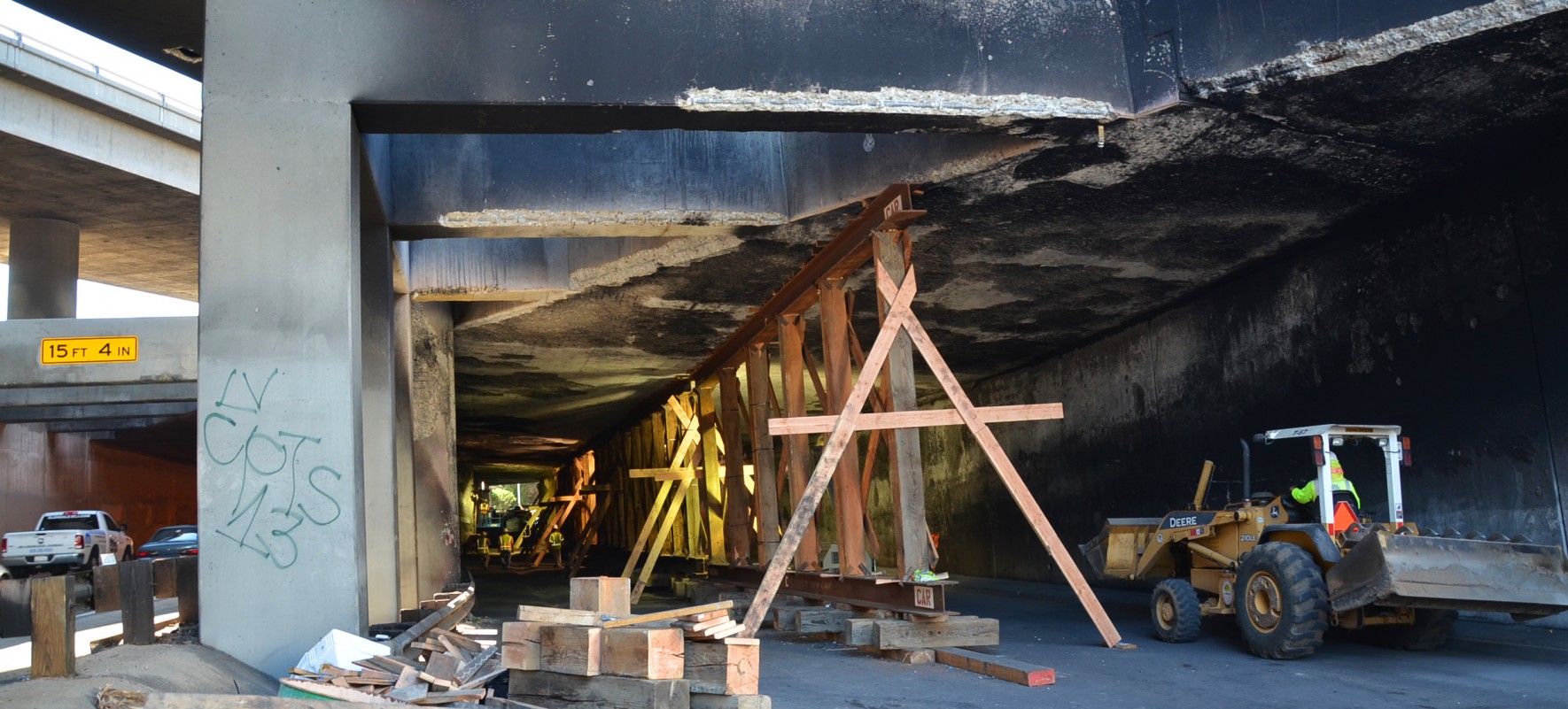 Though no injuries resulted from the accident, I-5, the main north-south freeway in California, remained closed until emergency crews could install shoring to support the damaged underpass. Concerned about the structural integrity of the underpass, Caltrans retained WJE to evaluate the structure, which consisted of cast-in-place, mild-steel-reinforced concrete members.