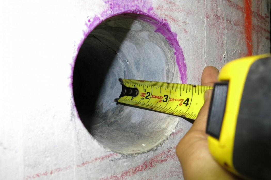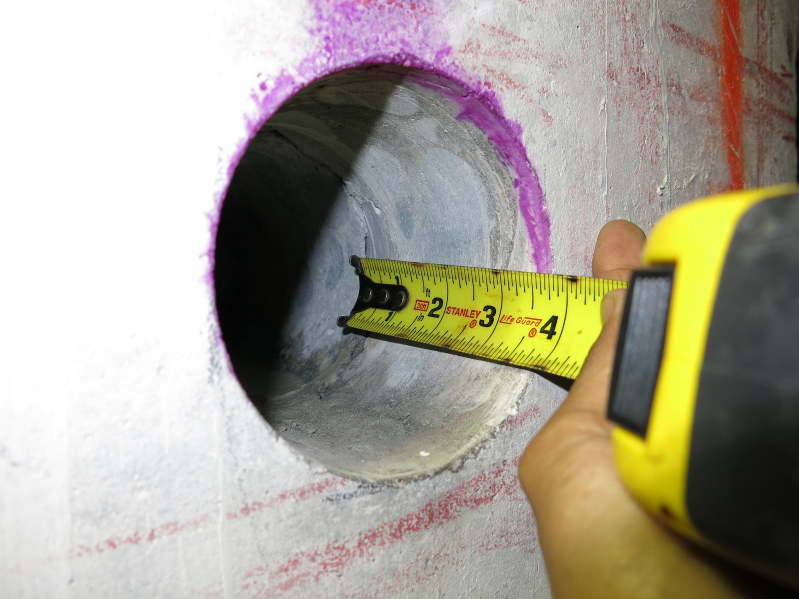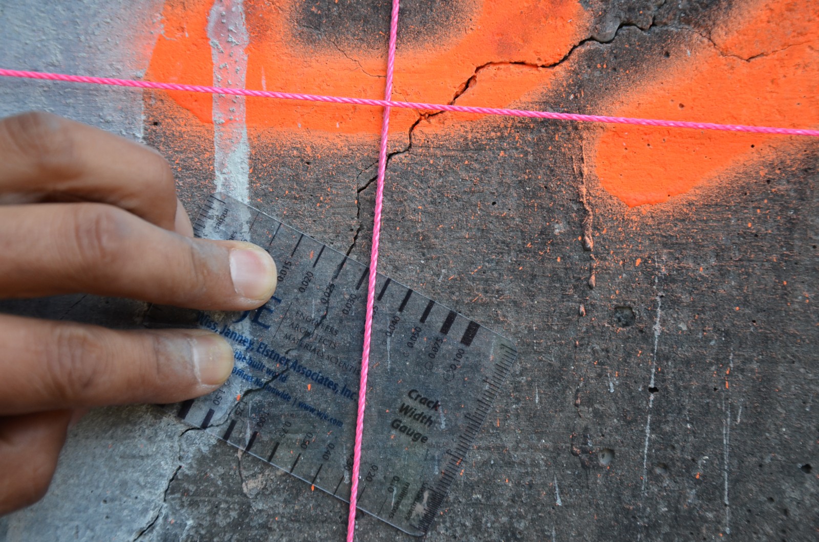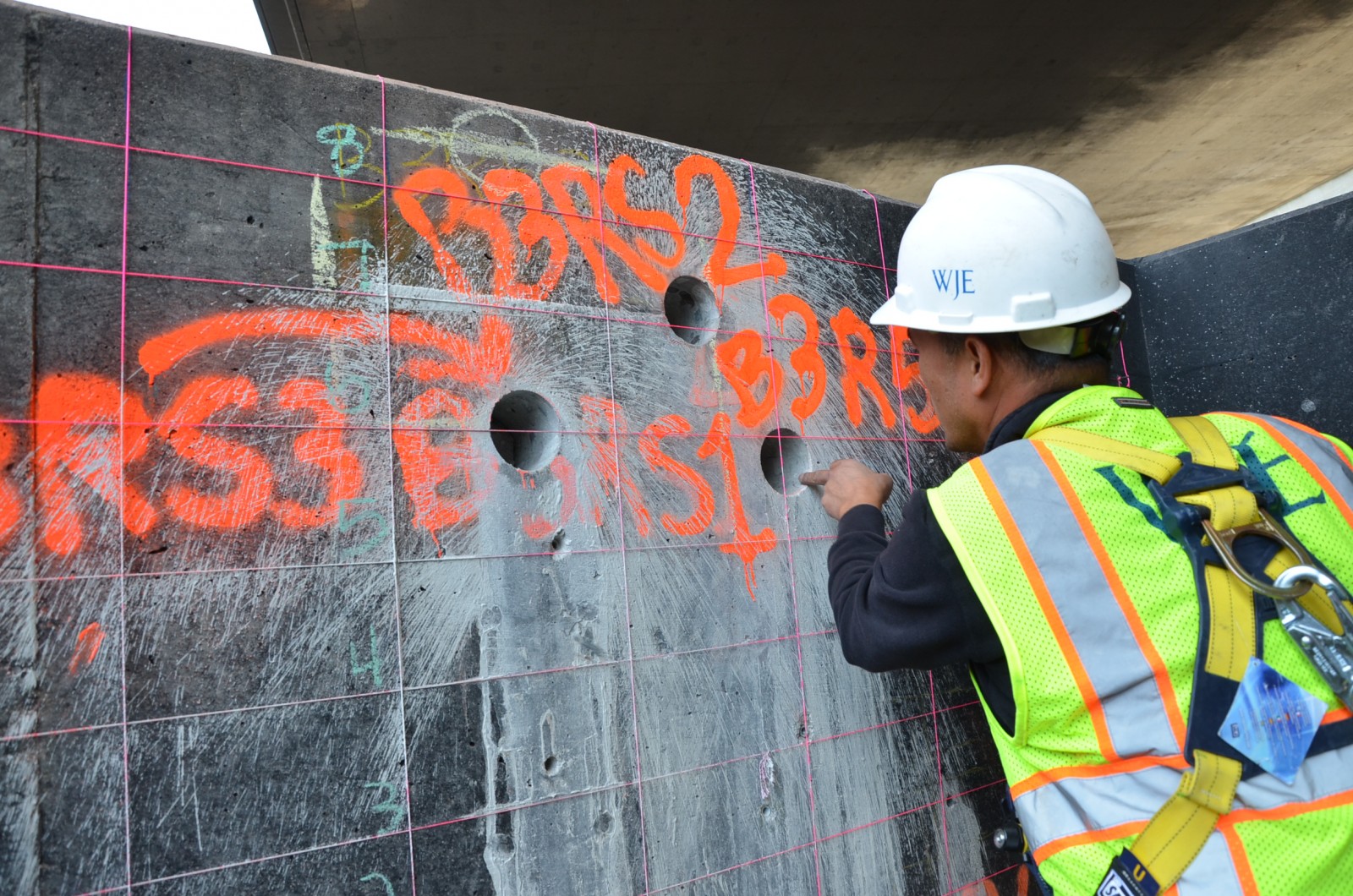 WJE's investigation consisted of two phases. During Phase 1, the structure was visually inspected, and core samples were removed from the walls, soffit, beams, and columns in areas exhibiting a range of conditions. In Phase 2, the structural elements were subjected to impact-echo (IE) testing to detect delaminations and locate internal cracks. Inspection core holes were used to calibrate and verify impact-echo results.