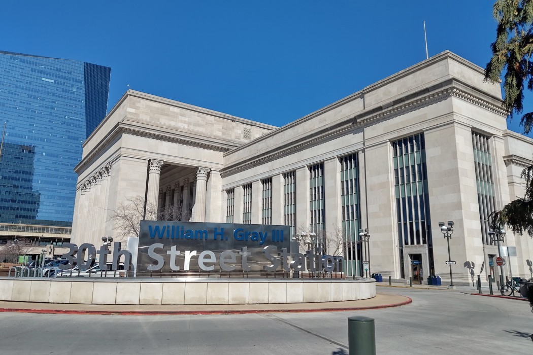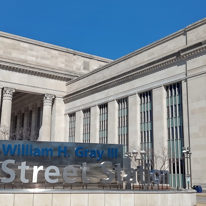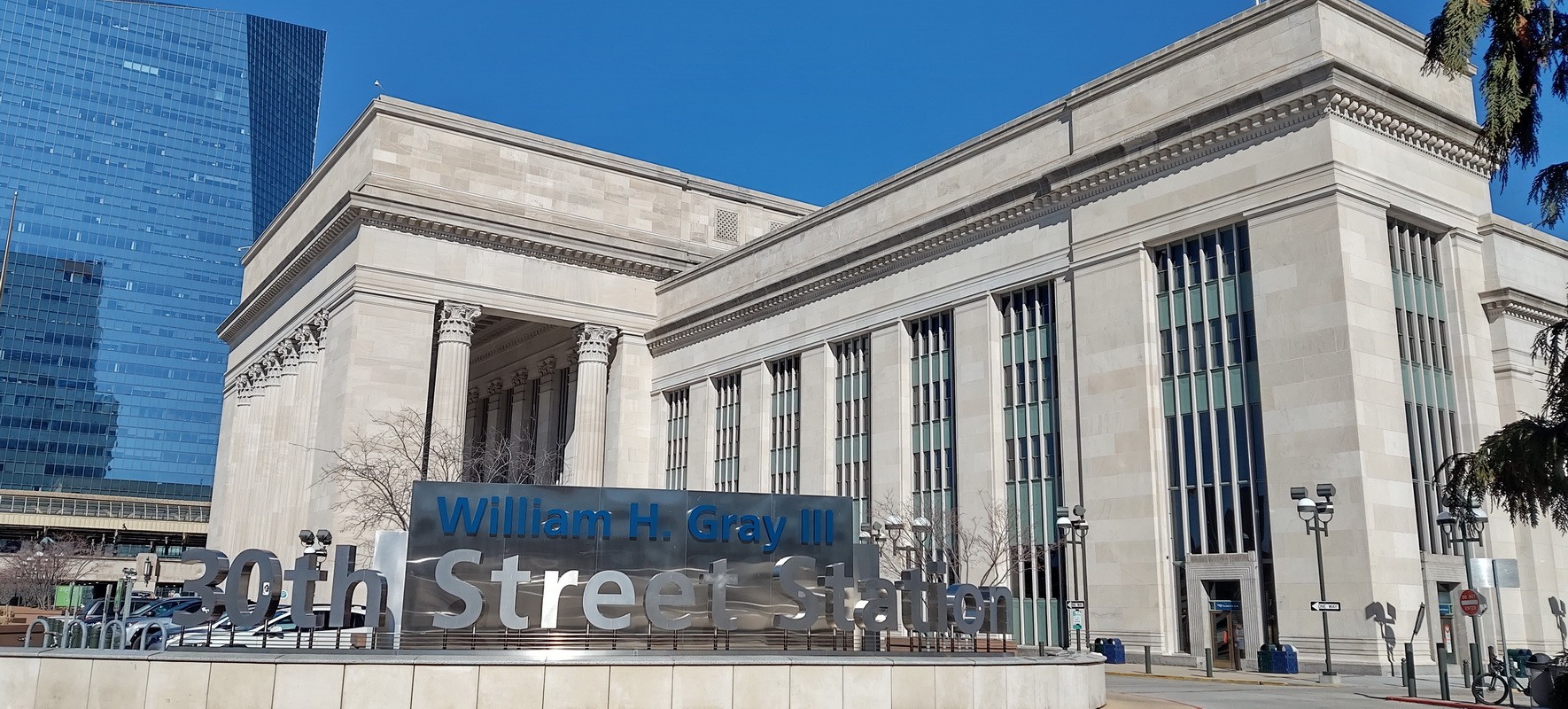 Completed in 1934, the station was designed by Chicago architecture firm Graham, Anderson, Probst & White and once served as the headquarters of the Pennsylvania Railroad Company. The facades of the building are clad with Alabama limestone that sits atop a horizontal base of pink granite. Curtain walls with cast-iron mullions and steel-framed windows punctuate the limestone facade and original bronze doors provide access to the five-story, travertine-clad concourse. Two internal light courts are clad in buff-colored brick with prism glass windows allowing natural light into the concourse.