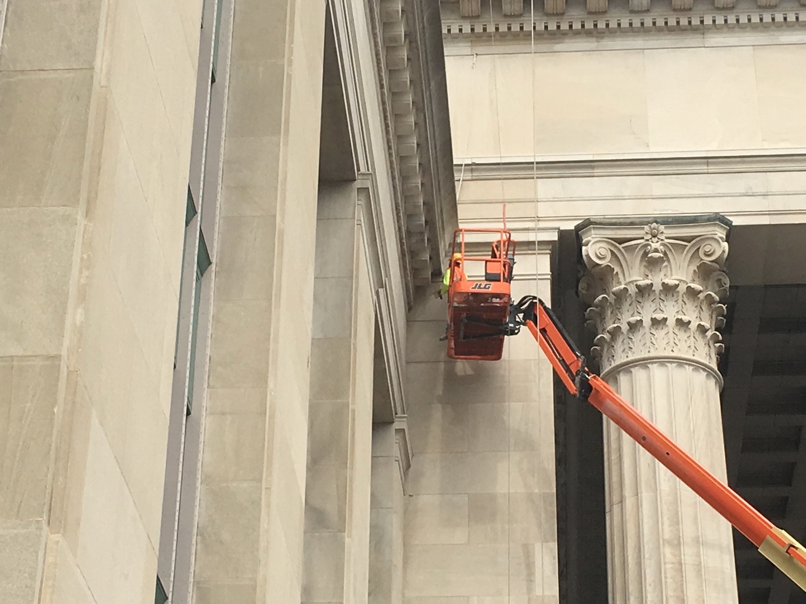 The WJE team prepared construction drawings and specifications for comprehensive restoration of the facade, including limestone repair, restoration, and cleaning; brick masonry repairs; restoration of cast iron mullions and steel-framed windows at the curtain walls; and restoration of selected bronze doors. Window frame and sash components were dismantled and taken off-site for hazardous material abatement, repair, recoating, reglazing, and application of blast film under controlled conditions. During the construction period, WJE’s services included full-time site observation throughout critical phases of the project and utilized tablet-based digital data collection and punch list management tools.